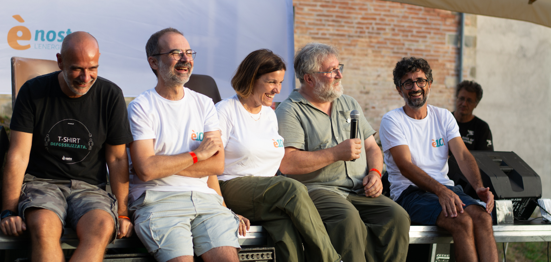 In un palco allestito sul prato, dietro il quale si scorgevano le pale della turbina ruotare tra gli alberi, illuminate suggestivamente da un faro, i fondatori di ènostra – Matteo Zulianello, Davide Zanoni, Gianluca Ruggieri e Sara Capuzzo – hanno raccontato le giornate campali di nascita della prima cooperativa energetica italiana nel lontano 2014. All’epoca il termine “prosumer” veniva introdotto timidamente nel panorama italiano tra gli studiosi dell’energia, mentre i pionieri fondatori di ènostra con una certa audacia costituivano una cooperativa proprio per dare concretezza e una dimensione collettiva a questo concetto, consumando l’energia prodotta dagli impianti cofinanziati.