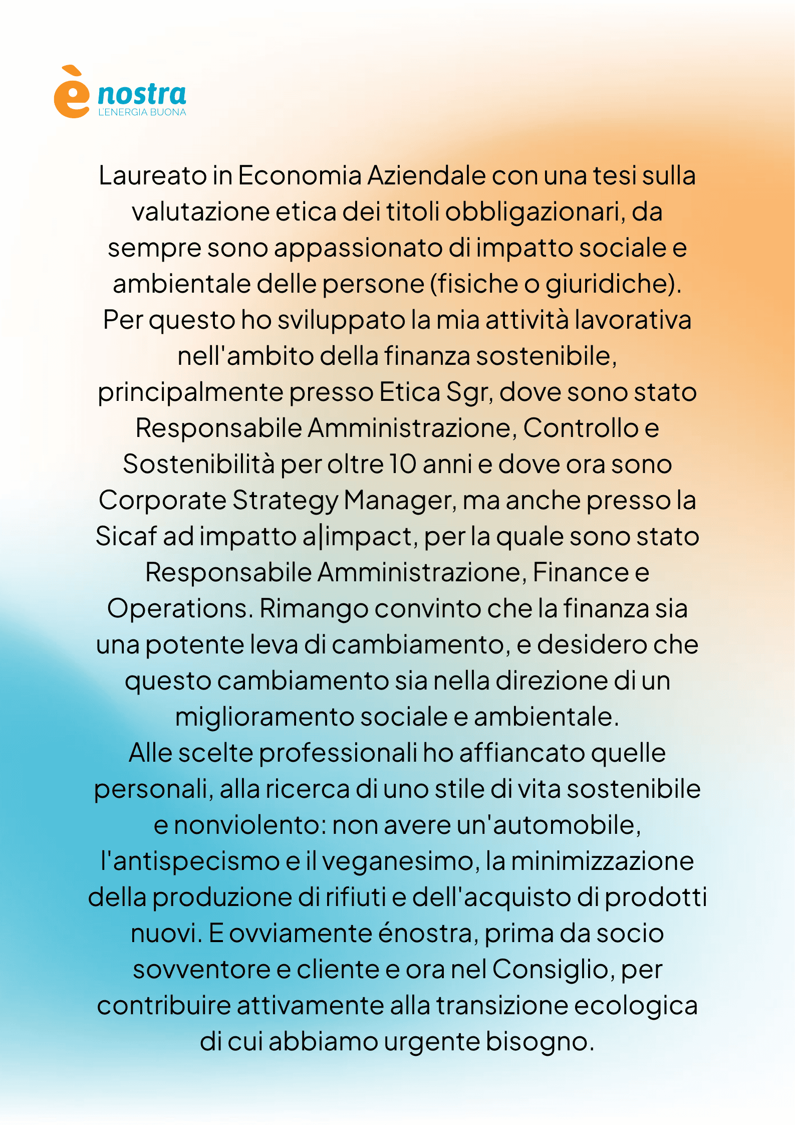 Laureato in Ingegneria Gestionale, ha conseguito un Master sull’impiego di energie rinnovabili. Nel 2005 inizia a lavorare presso Banca Popolare Etica occupandosi della creazione di prodotti finanziari…