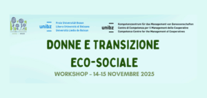 Venerdì 14 novembre, presso la Libera Università di Bolzano (Bressanone) e sabato 15 novembre presso la Federazione Trentina delle Cooperative (Trento), si svolgerà il workshop “Donne e transizione eco-sociale”.