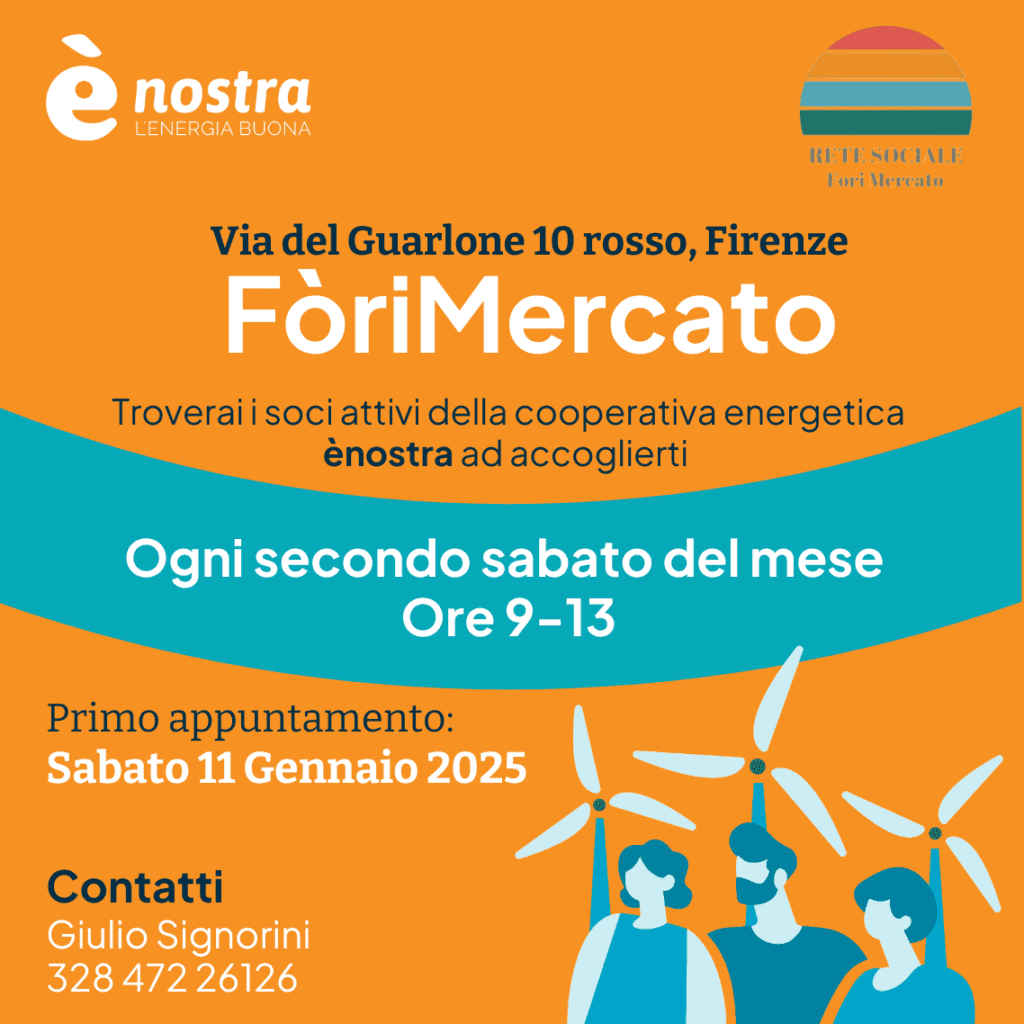 A partire da sabato 11 gennaio 2025, ogni secondo sabato del mese troverai i soci attivi fiorentini di ènostra presso la rete FòriMercato, progetto sociale e collettivo improntato al mutualismo e all’aiuto in comunità, in via del Guarlone 10 rosso, a Firenze. Presso lo Sportello Informativo sarà possibile chiedere informazioni sulle tariffe, sulla fornitura di elettricità 100% rinnovabile e cooperativa, sulle attività e progetti di ènostra, sulle CER e molto altro.