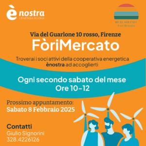 Lo scorso sabato 11 gennaio 2025, i soci fiorentini di ènostra hanno iniziato a tenere uno Sportello Informativo sulla cooperativa, che sarà attivo dalle 10 alle 12 ogni secondo sabato del mese presso la rete FòriMercato, progetto sociale e collettivo improntato al mutualismo e all’aiuto in comunità, in via del Guarlone 10 rosso, a Firenze. Presso lo Sportello sarà possibile chiedere informazioni sulle tariffe, sulla fornitura di elettricità 100% rinnovabile e cooperativa, sulle attività e progetti di ènostra, sulle CER e molto altro.