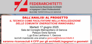 Martedì 17 giugno 2025 presso la Sala del Consiglio Metropolitano di Genova, Palazzo Doria Spinola L.go Eros Lanfranco 1, si terrà l’evento “Dall’analisi al progetto: il tecnico come facilitatore nella realizzazione delle comunità energetiche rinnovabili”, organizzato da “Federarchitetti”.