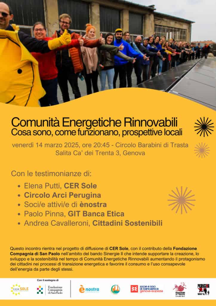 Comunità Energetiche Rinnovabili: cosa sono, come funzionano, prospettive locali: questo il titolo dell’incontro gratuito per approfondire il tema delle CER che si terrà venerdì 14 marzo a Genova presso il Circolo Barabini di Trasta – Salita Ca’ dei Trenta 3 alle ore 20:45.