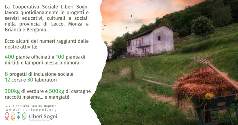 Per aiutare Liberi Sogni a procedere con la ristrutturazione e rigenerazione della Cascina, tramite la campagna Vivi e sostieni Cascina Rapello è anche possibile donare una tegola o un mattone: ogni piccolo contributo aiuterà a rendere concreto il sogno di un luogo in natura polifunzionale e 100% sostenibile.