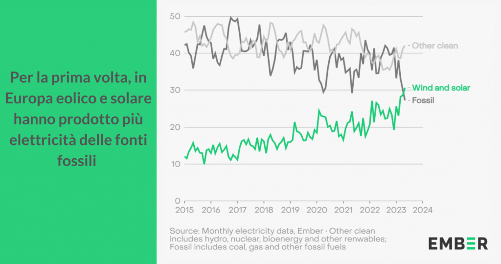 ;A maggio 2023 eolico e solare hanno prodotto 59 TWh di elettricità in Europa, superando le fonti fossili: “la transizione procede a un ritmo velocissimo”, secondo Sarah Brown, responsabile di Ember Europa